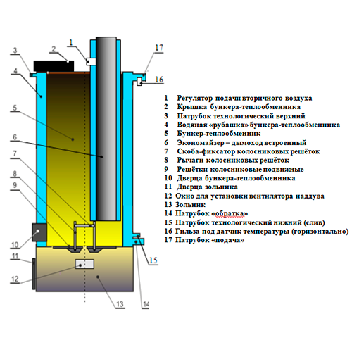 2.3 Загрузка топлива осуществляется в загрузочный бункер-теплообменник (5) сверху, предварительно сняв крышку (2). За счет собственного веса топливо поступает по бункеру в зону горения, где происходит его возгорание с выделением большого количества тепла. Выделяемое тепло передаётся теплоносителю, находящемуся в кольцевой «рубашке» бункера-теплообменника (4) опоясывающей всю зону горения. Дымовые газы выходят из зоны горения через встроенный экономайзер-дымоход котла (6), внутри которого происходит догорание несгоревших газов и передача тепла теплоносителю, находящемуся в кольцевой «рубашке» экономайзера-дымохода. Для интенсификации горения газов в экономайзере-дымоходе в конструкции котла предусмотрен регулятор подачи вторичного воздуха (1). Теплоноситель поступает через патрубок (14) в бункер-теплообменник, где происходит его частичный нагрев, и через промежуточные патрубки попадает в экономайзер-дымоход (6). В экономайзере-дымоходе теплоноситель разогревается до заданной температуры и выходит в систему отопления через подающий патрубок (17). Остатки сгоревшего топлива в виде золы поступают в зольник (13) через колосниковые решетки (9) и периодически удаляются через дверцу (11).
