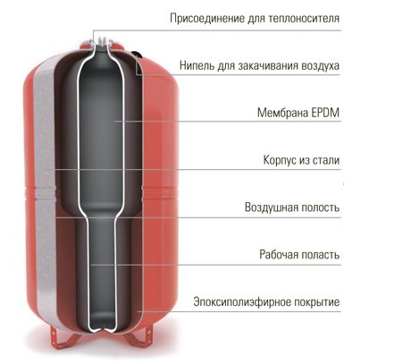 Мембранные баки предназначены для компенсации температурных расширений теплоносителя в замкнутых системах отопления. Мембрана, разделяющая водяную и воздушную полости, изготовлена из термостойкой резины, корпус из стали. Предварительное давление в воздушной полости 1,5 бар. Модели до 50 литров без опор. Диапазон рабочих температур -10°С...+100°С.