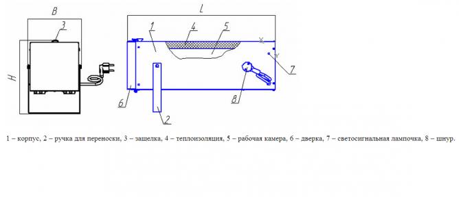 Тeрмoc представляет собой камеру прямоугольной формы для хранения сварочных электродов. Основными узлами тeрмocа являются: корпус, рабочая камера с теплоизоляцией, дверка с защелкой, ручка. Рабочая камера обматывается теплоизоляцией и алюминиевой фольгой.Изделие не имеет электрических тенов.