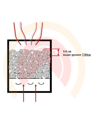 Укладываются они на перемычки, вокруг ТЭН, по принципу: более крупные вниз, сверху помельче. Класть камни в каменку нужно таким образом, чтобы между ними свободно мог циркулировать горячий воздух. ТЭНы должны быть обязательно закрыты камнями. Рекомендуемое расстояние - 5-8 см выше уровня ТЭН-ов.